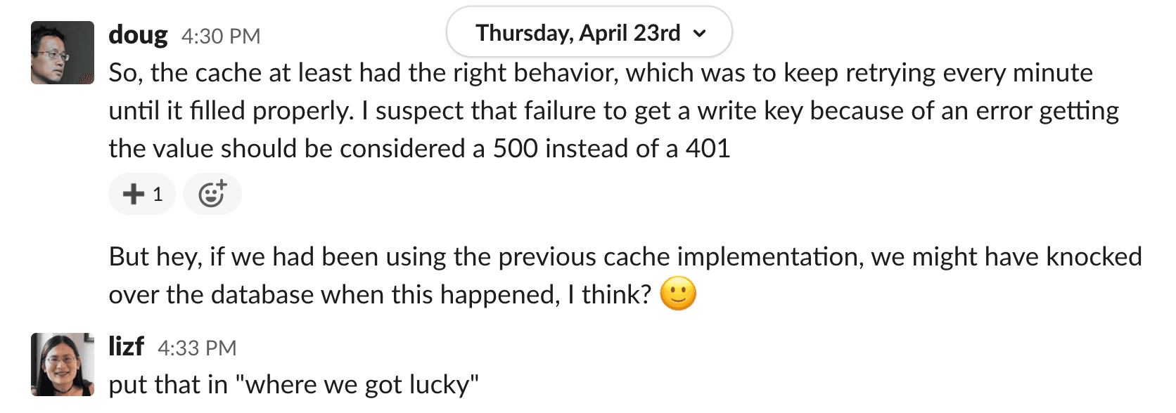 Our caching implementation cached a null value and did not report that as an error. While our retry and circuit breaker logic worked as intended by preventing the database from being hammered, it also hid a critical error that was occurring.