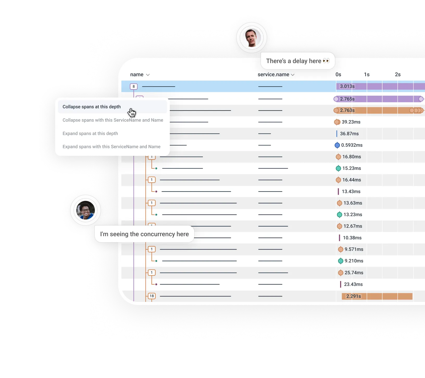 Every team is looking at the same trace view. See what your service did, who called it, and how each dependency responded. No more 'your logs vs. my logs.'