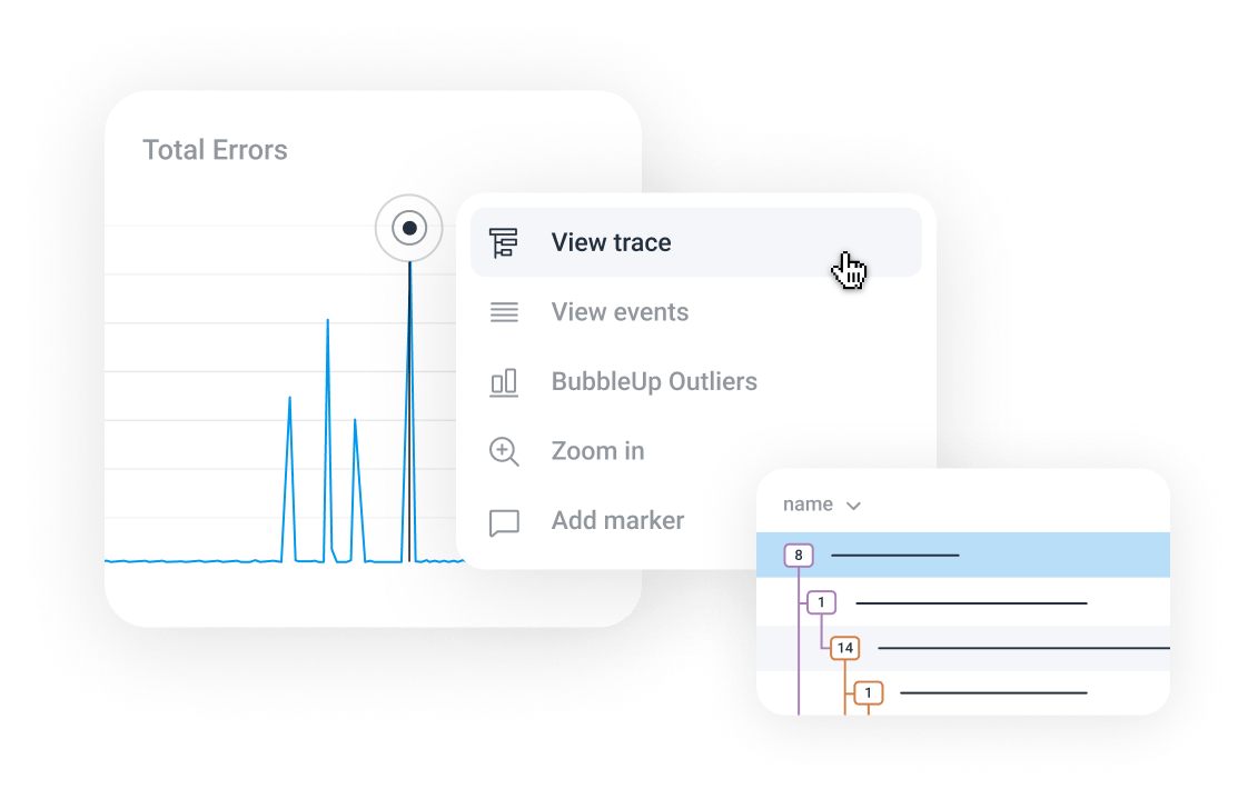 Say goodbye to slow queries and dashboards that dead-end. Whether you know exactly what you're looking for or you're just poking through the data, results from Honeycomb's query engine are unbelievably fast. Visualizations are dynamic and explorable, encouraging and empowering investigation.