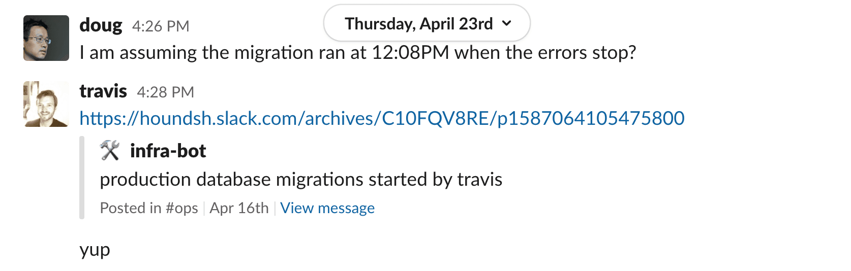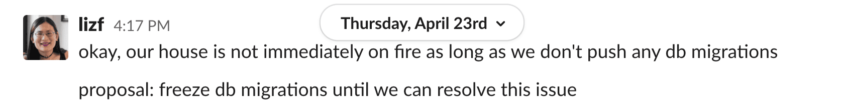 On April 16, we initiated a database migration that was not applied immediately. Normally, our automated deploy process will pause deployments when a migration is pending. However, in this case, a new deployment was still somehow published. Having a newly deployed binary meant that any new hosts created as part of an autoscaling group would get the new build.