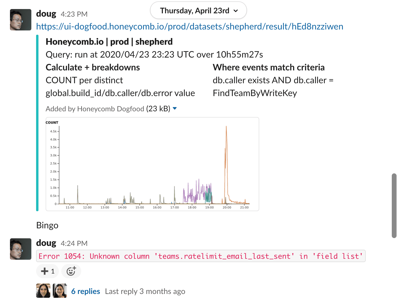 We use deployment version as a column across all of our events, so it was quickly evident when an unexpected mismatch across some hosts occurred. We were able to identify problems by comparing hostname, deployment version, and http response (high-cardinality fields).