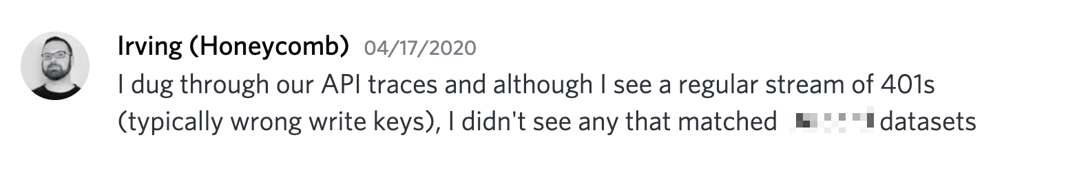 On the 23rd of April, we discovered that an incident had occurred approximately one week earlier. On April 16, for approximately 1.5 hours we rejected approximately 10% of event traffic to our API hosts. Four of our API servers rejected all traffic with either a 500 or 401 HTTP response. The incident went unnoticed for around a week until a customer brought this to our attention enquiring about data they were missing.