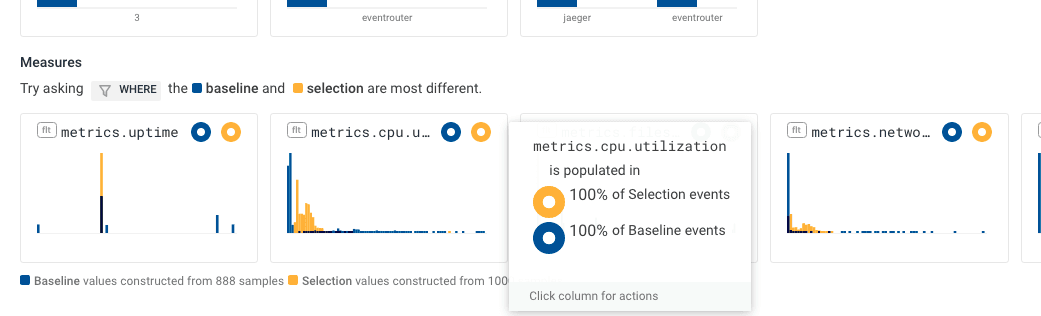 An infrequently-used function of Honeycomb’s BubbleUp feature is how you can correlate your selection with distributions on other numeric attributes. For example, you might look at whether memory utilization correlates with high CPU and low disk activity. The histogram distribution for numeric attributes will show up just below the string attributes, in the Measures section of the BubbleUp results.