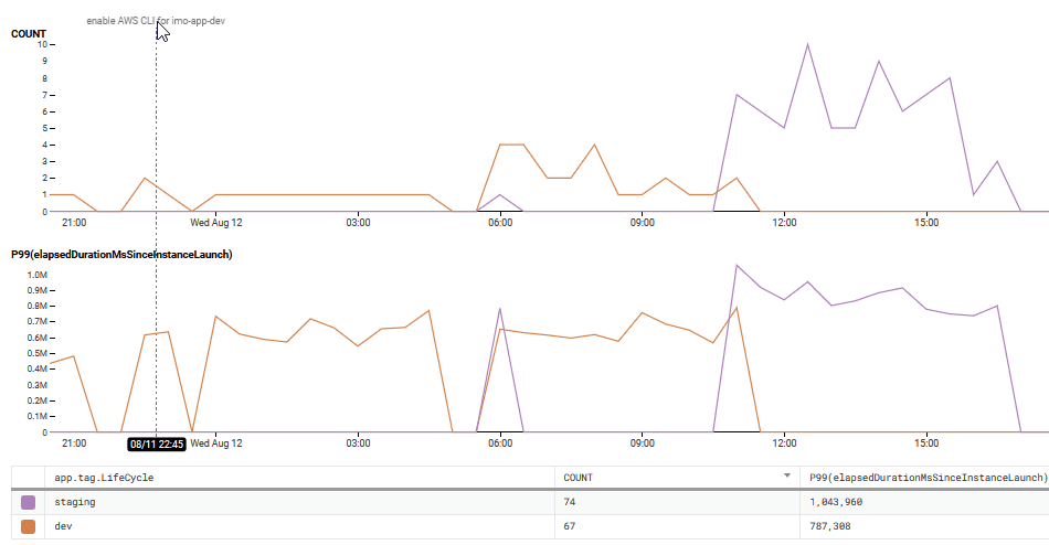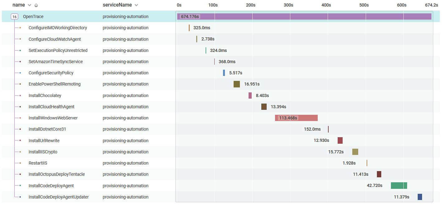 Initially, we deployed the change to our lowest application environment and compared the performance delta.One of our key performance metrics is time from instance launch until application code begins installation. Our logs made this difficult to calculate for a single instance and impossible to measure at scale. Our trace data, however, made this simple: measure what matters to your users.