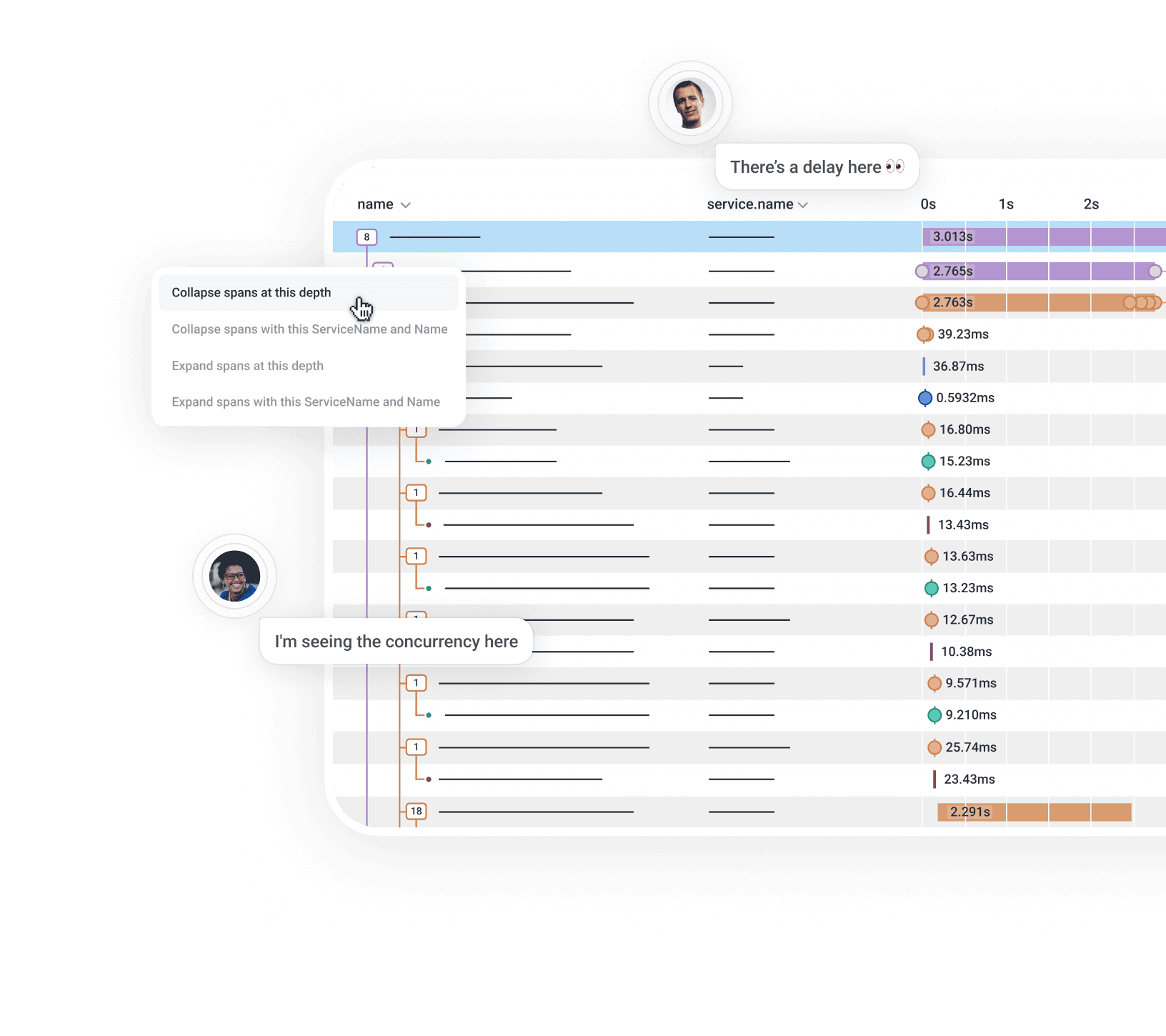 Look under the hood of any trace span. See every field and every log statement, and better understand the interconnections between services. Zoom in for details, zoom out for the big picture.